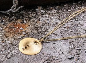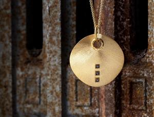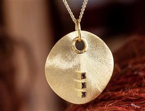 18 Karat vergoldetes 925/- Sterlingsilber mit gebürsteter Oberfläche formt sich zu einer mit drei im Princess-Schliff geschliffenen Rauchquarze (insgesamt 0,21ct) versehenen Schmuck-Scheibe in besonderer Manufakturqualität. Die in Hammerschlagoptik gearbeitete Umrandung des Ösenloches sorgt für die besonders hochwertige und markante Ausstrahlung dieses handgearbeiteten Schmuckstücks aus der Feder des renommierten Osnabrücker Designers Dietmar Sebastian. Wir empfehlen diesen Designschmuckanhänger an einer längeren Kette oder einem längeren Band (ab 50cm). Auch in einer größeren Version mit Blautopasen erhältlich.