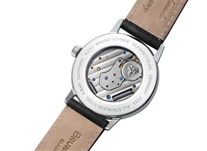Quarzwerk in veredelter Bruno Söhnle-Ausführung (Basiswerk Ronda 6003.B), Höhe 9,0 mm, Bandanstoß zu Bandanstoß 45,9 mm, Echtlederband schwarz mit Ziernaht Ton in Ton, Bandverlauf 20/18 mm.