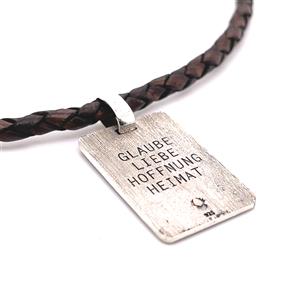 Unter diesem Vorsatz haben wir ein paar Schmuckstücke entworfen um diesen lang bewährten Tugenden ein neues Design zu verpassen. Die hier abgebildete kleinere, geschwärzte Variate eignet sich perfekt als Männerschmuck an einem groben Lederband oder an einer groben Silberkette. Die vier Schlagwörter sind auf der Rückseite eingelassen und schwarz betont, sie bietet zusätzlich Platz um diesen besonderen Anhänger mit einer Gravur zu personalisieren. Die Vorderseite zeigt unsere Interpretation von Glaube-Liebe-Hoffnung-Heimat