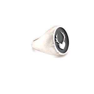 Unser Siegelring zeigt das Symbol unseres Herzgeweihs auf dem Ringkopf. Die verspielte Umrandung zieht sich über die seitliche Fläche und lockert somit die klassische Siegelringform auf und verleiht diesem einen sehr modernen Look. Mit diesem Ring setzen Sie definitiv ein Statement und offenbaren sich als wahren Schwarzwaldschmuck-liebhaber. Das Herzgeweih die Umrandung und die Innenfläche der Ringschiene sind poliert, die Außenfläche des Ringes ist Strichmatt und die Vertiefung auf dem Ringkopf wurde Sandgestrahlt und geschwärzt.