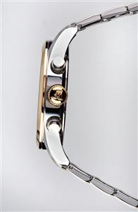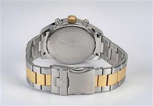 Das Modell 42-6.1H von Jacques Lemans ist ein klassisch, sportlicher Zeitmesser mit einem dezent, eleganten Touch. Das Gehäuse aus massiv Edelstahl/316L IP-gold hat einen Durchmesser von 42mm. Es umrahmt ein schönes, silbernes Zifferblatt mit Sonnenschliff und hellen Chronoringen für 24-Stunden Anzeige, Minuten- und Sekundenzähler und zeigt auch ein kleines Datum zwischen vier und fünf Uhr. Dieses Modell hat ein Quarzwerk, gehärtetes Crystex Glas, einen runden, verschraubten Gehäuseboden und eine Wasserdichtigkeit von bis zu 10ATM. Das Band aus massiv Edelstahl/316L IP-gold/bicolor mit Sicherheitsfaltschließe rundet den edlen Look perfekt ab – dieser Chronograph ist ein markanter Zeitmesser, der seine Wirkung immer behalten wird.