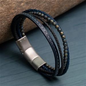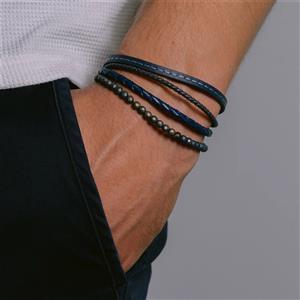 Das blaue Echtleder-Armband besticht durch elegante Hematite-Perlen, begleitet von zwei weiteren stilvollen Bändern in Flecht- und glattem Stil mit außenliegender Naht. Der silberne Magnetverschluss ergänzt das blaue Farbenspiel optisch perfekt.