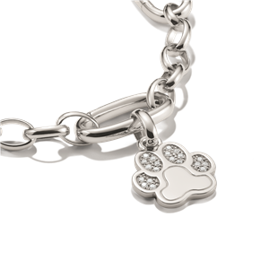 – In Form einer Pfote mit feinen Gravurlinien und kleinen, weißen Zirkonia-Steinen
