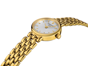 Dieses Modell aus der Tissot Lovely Kollektion hat ein 316L – Edelstahlgehäuse mit gelbgoldfarbener PVD-Beschichtung und ein makelloses, schlichtes Zifferblatt in silberfarben mit Indizes sowie ein massives 316L – Edelstahlarmband mit Butterfly-Faltschließe und Drückern mit gelbgoldfarbener PVD-Beschichtung.